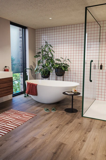 Welchen Bodenbelag wählst du am besten für dein Badezimmer? Keramikfliesen sind schön und wasserfest, fühlen sich aber ohne Fußbodenheizung kalt an. Parkett hingegen fühlt sich warm und behaglich an, verträgt sich aber leider nicht gut mit Feuchtigkeit und Temperaturschwankungen. Mit Klick-Vinyl im Badezimmer vereinst du jedoch das Beste aus beiden Welten. Unter einer freistehenden Badewanne, neben der Dusche oder beim Regal, an dem nasse Handtücher tropfen… Vinyl ist ideal für jeden Bereich in deinem Badezimmer. Und da du aus vielen Kollektionen wählen kannst, findest du zweifellos einen Boden, der zu deinem Badezimmer passt. Noch besser? Parkettvinyl eignet sich für die meisten Arten von Fußbodenheizungen und ist zudem sehr pflegeleicht!