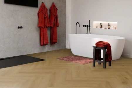 Eine elegante Note im Badezimmer? Kein Problem für Parquetvinyl. Mit einem Vinylboden im Fischgrätenmuster verwandelst du deine tägliche Badezimmerroutine in einen luxuriösen Verwöhnmoment. Ein warmes und angenehmes Gefühl unter den Füßen und eine edle Bodenoptik? Check.